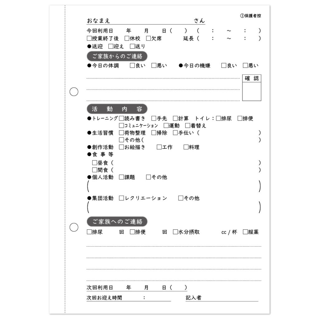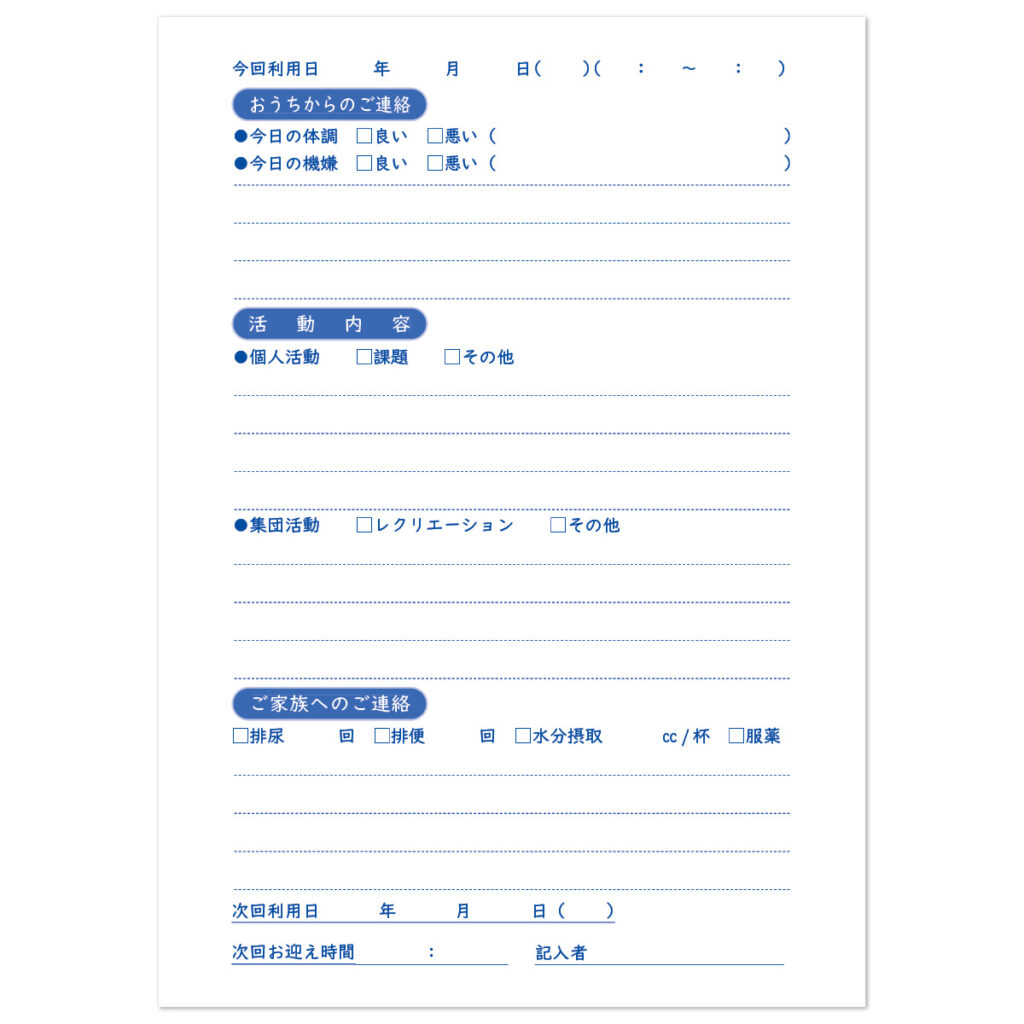 毎日の活動や体調、行動の変化を記録することで、家庭と事業所の橋渡しとなる重要なツールです。